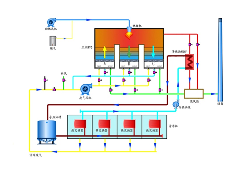 涂布行業(yè)產(chǎn)生廢氣的特點為排風量中等,廢氣濃度高,且廢氣中熱值高的成分占比高,RTO后煙氣熱回收價值高,一般可在RTO的熱旁通的管道設(shè)置導熱油或蒸汽余熱鍋爐,可達標,經(jīng)濟性也較好。
